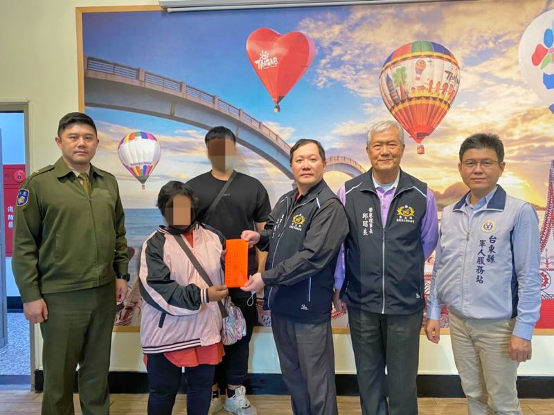 台東縣軍人服務站長曾仁政暨後備憲兵荷松協會理事長江明俊及榮譽理事長邱昭良在憲兵隊長廖中校陪同探視關懷並致贈慰問金