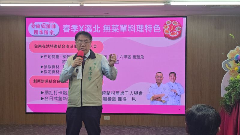 臺南市長黃偉哲今(11)日出席活動宣傳記者會,替大家搶先試吃料理,也邀請民眾一起來臺南探索最驚喜、最滋味豐富的辦桌料理。首梯春季場將於4月26日在柳營德元埤荷蘭村盛大展開,限量100桌,想品味創新辦桌料理或提早慶祝母親節的朋友千萬別錯過。