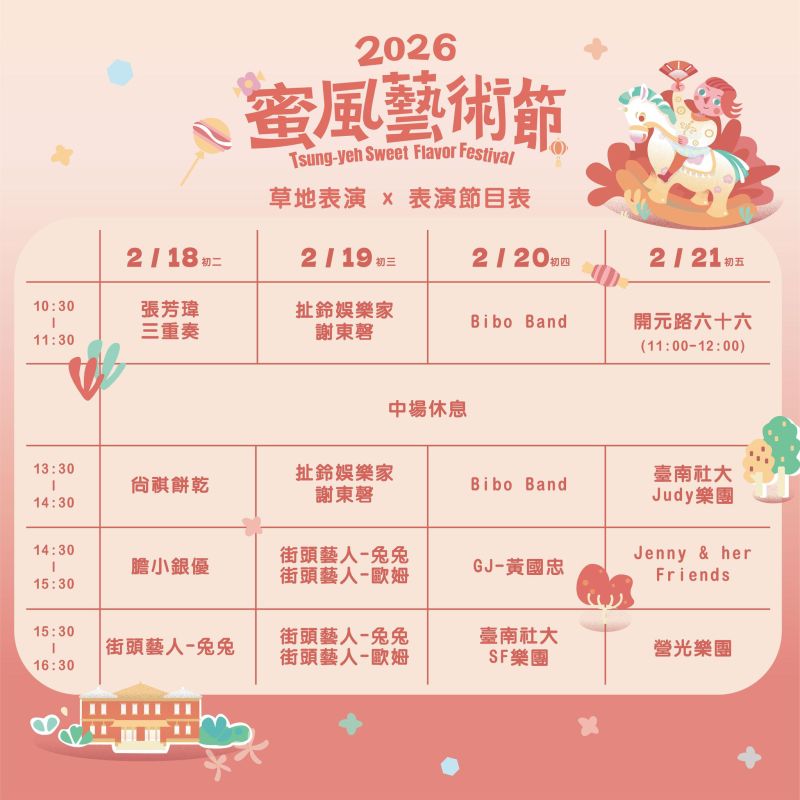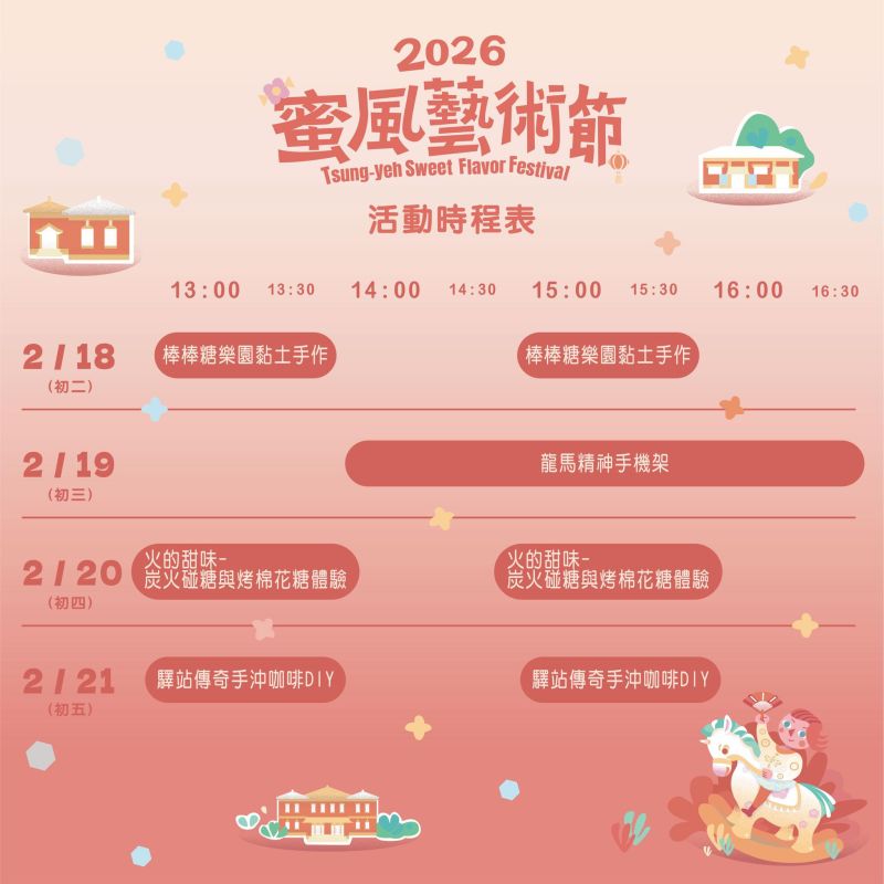 總爺藝文中心於春節假期除了小年夜至初一(15至17日)休館,初二(18日)即開館正常營運,展館開放時間每日上午9:00至下午5:00;蜜風藝術節活動從初二至初五讓大家吃甜甜,過好年,除了精彩的表演外,還可以跟入口處的木馬合影,一起留下最難忘又美好的甜蜜回憶。