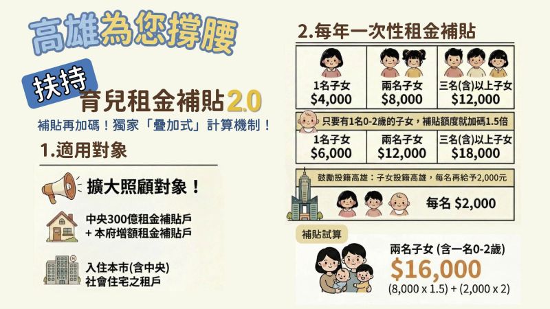 同時,市府將「育兒租金補貼」升級為2.0版本,適用對象涵蓋中央及地方興建社宅住戶、中央核定租金補貼戶,以及高雄市增額租金補貼對象,預計可照顧12,560戶育兒租屋家庭。透過擴大涵蓋範圍及提高補貼權重,期盼有效減輕育兒家庭在居住與照顧上的經濟壓力,並優先引導入住功能完善的社會住宅。