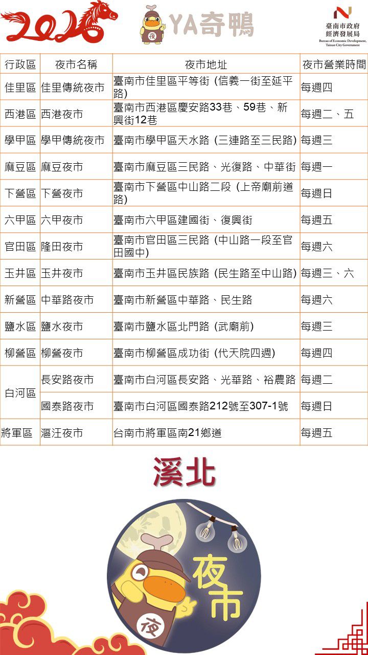 除上述市集外,臺南還有很多夜市會輪番上陣,每天都有不同的夜市陪伴,新鮮感十足,歡樂感滿滿。臺南各夜市春節營業時間表,請參閱相關資訊和官網及臉書喔~