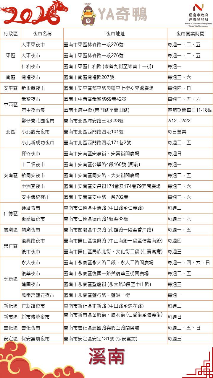 臺南市市場處代理處長林士群也表示,今年除夕適逢週一,原週一營業之夜市,包括大東、大東東、仁和、永大、中興、鹽行、麻豆、什二佃、關廟等夜市,照常營業,方便市民與返鄉遊子團圓出遊。除此之外,南臺灣唯一五星夜市-花園夜市,特別增加營業日,年節期間連續營業11日;適逢假日即營業的府中街市集,也推出一系列特別活動,各種文創是親子走春必訪;還有歷久不衰臺南人的共同回憶-小北觀光夜市,當然也不會缺席;這些市集春節期間每天都有營業,陪伴民眾一起過新年。