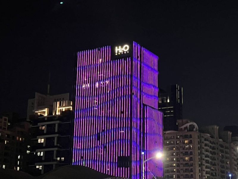 高雄多處熱門觀光景點熱烈響應加入點燈應援行列,紛紛亮起粉色燈海閃耀港都夜晚(圖為大立百貨、H2O水京棧國際酒店)。