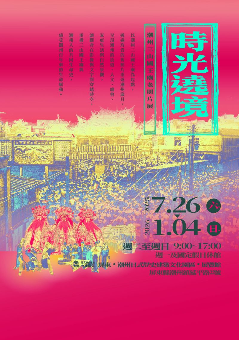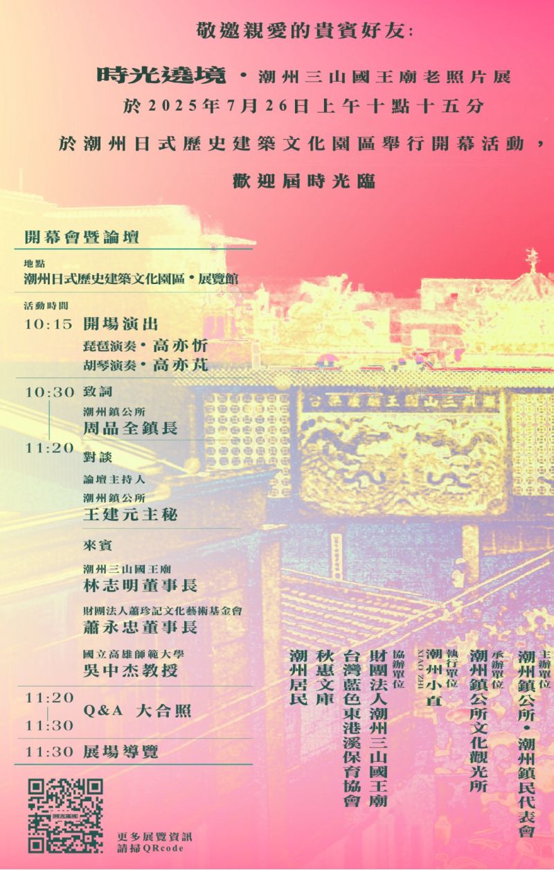 屏東縣潮州鎮公所特別策劃《三山國王廟老照片展》,現場分五大展區,展出許多珍貴的歷史影像,從廟宇、街景、民生,到人情風貌,邀請大家穿越時空、重新認識潮州。而在展覽開幕當天,更舉辦了一場別具意義的開幕論壇,邀請學者與地方領袖共同分享潮州的歷史文化與未來展望。