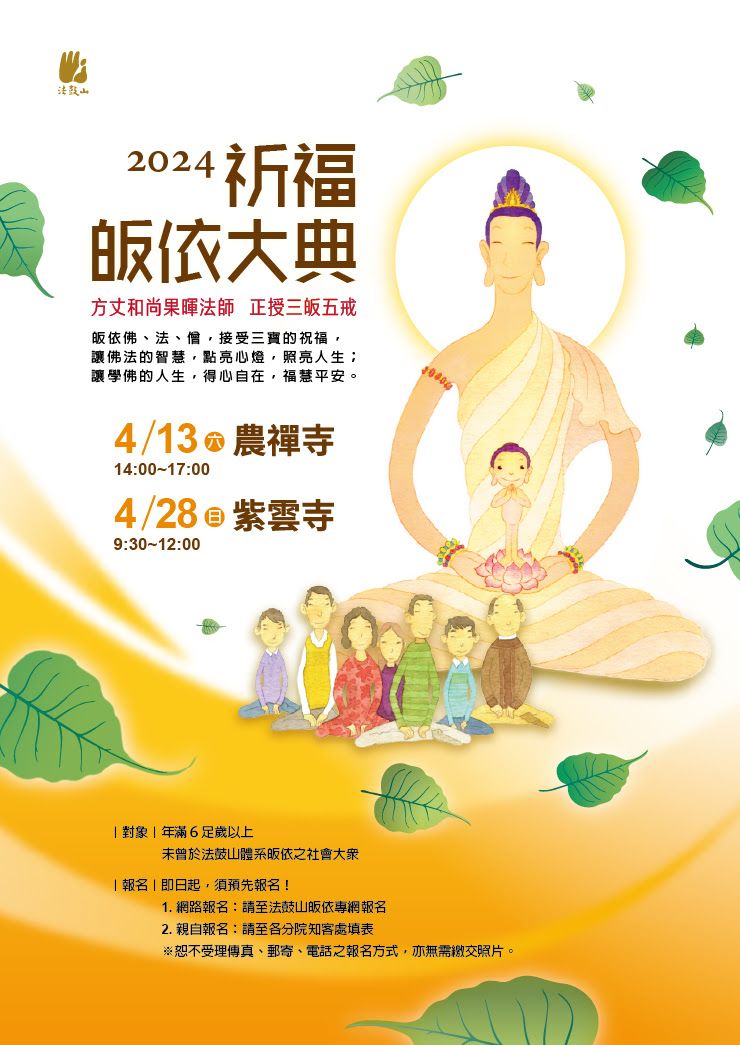 法鼓山即將於4/13北投農禪寺、4/28高雄紫雲寺舉辦「2024年祈福皈依大典」,禮請方丈和尚果暉法師陞座說法、親授三皈五戒;僧團法師則藉由結緣佛牌與法寶,分享佛、法、僧的祝福。