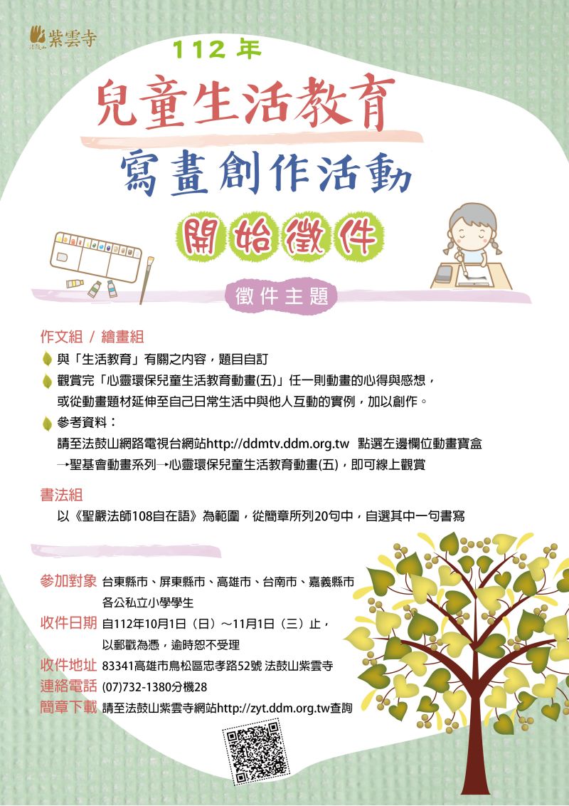 2023年「兒童生活教育寫畫創作活動」自10/1起至11/1止開放收件。法鼓山紫雲寺為促進兒童身心健康,邀請臺東、屏東、高雄、臺南、嘉義、雲林等地區的公私立小學學童,在生活中尋找靈感,融合心靈環保的理念,創作出專屬於每個小朋友獨一無二的作品。