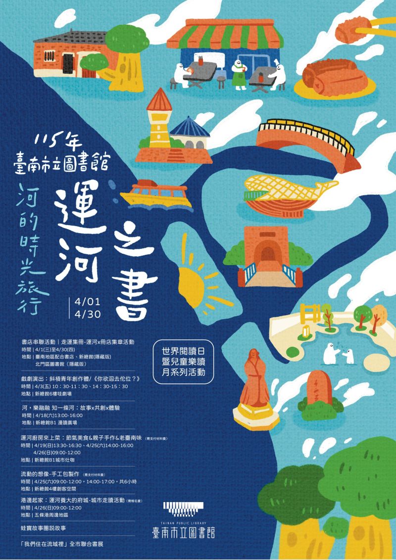 為迎接即將到來的4月世界閱讀日暨兒童樂讀月,並呼應臺南運河開通100週年的歷史意義,臺南市立圖書館以「運河之書:河的時光旅行」為主題,串聯閱讀推廣、戲劇演出、手作體驗、美食文化與城市走讀,整個4月天邀請市民搭上閱讀的船筏,展開一場穿梭時光的城市探索之旅。