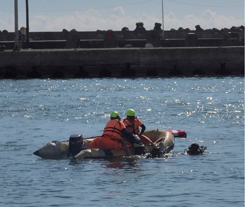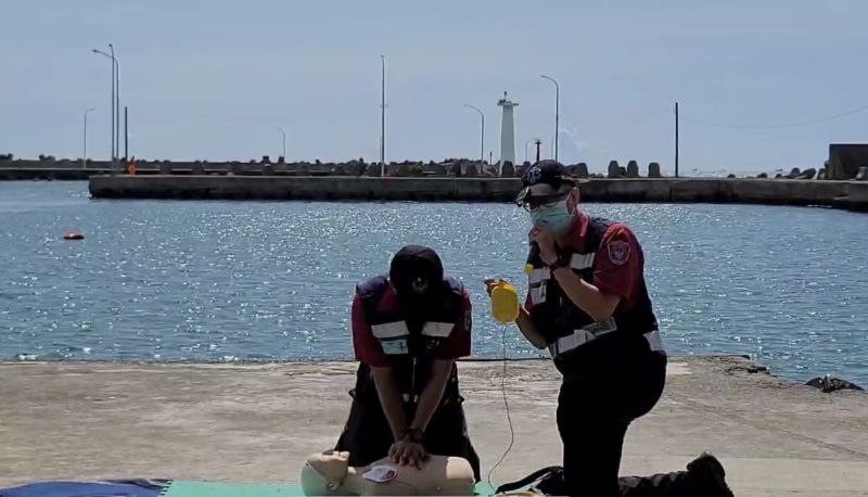 與高雄市政府消防局第四大隊梓官消防分隊共同演練,結合水上摩托車、30P橡皮艇、潛水裝備、行動救援車及AED自動體外心臟電擊去顫器等科技裝備,生動演繹救援實境,展現出海巡及消防單位協作默契。