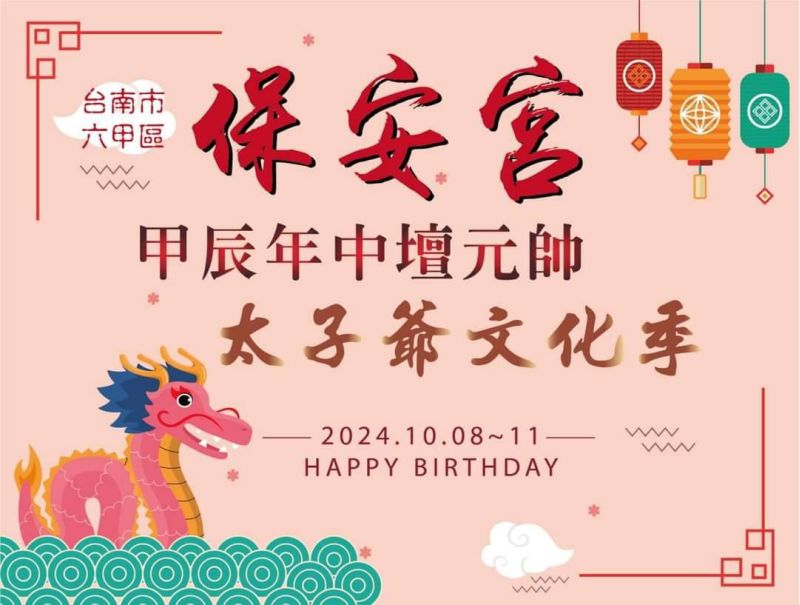 台南市六甲區身為歷史古鎮,便保有此種歷史發展軌跡,六甲保安宮隨著歷史發展,護佑黎民百姓,是六甲區重要信仰寄託,今年臺南400祈福活動陸續辦理,六甲保安宮都有共襄盛舉,年年辦理的「太子爺文化季」更是不曾中斷,形成一項獨特悠久的寺廟文化。時值甲辰年秋爽季節,歡迎大家踴躍參加,向太子爺祈福,讓太子爺庇護闔家平安,順心如意。