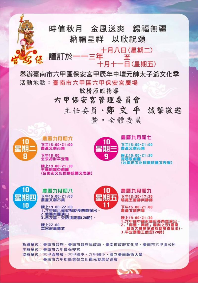 時值秋月、金風送爽,臺南市六甲區保安宮將於2024年10月08日至10月11日歷時4天,舉辦一年一度的「甲辰年中壇元帥太子爺文化季」活動。