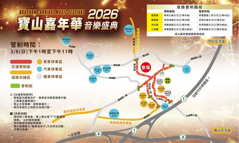 3/8寶山嘉年華音樂盛典 交通管制與停車資訊一次看懂