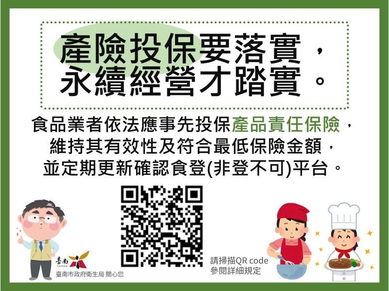 為強化食品安全衛生管理並保障消費者權益,衛生局提醒食品業者務必依《食品安全衛生管理法》第13條規定,依法投保「產品責任保險」。依法投保不僅是食品業者的法定義務,更是展現對消費者負責任態度的重要作為。