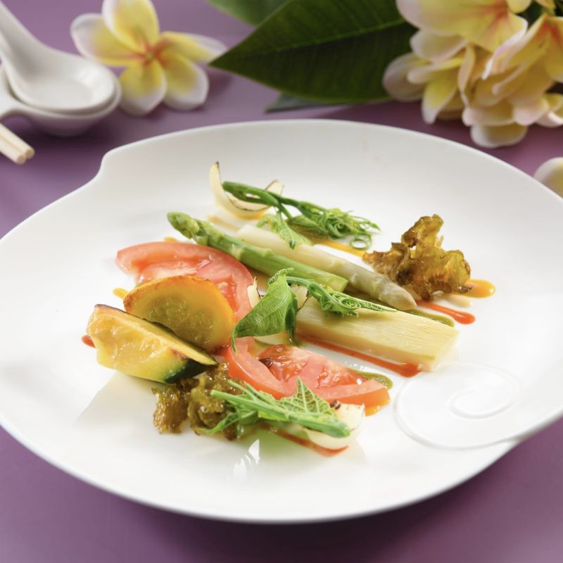 國宴料理頭盤「永續啟航」以各地蔬菜搭配5種醬汁,分別代表不同的民族,除客家桔醬、白腐乳、沙嗲醬外,台中東泉辣椒醬也在其中,較為特別的是「te’nas(音譯「特納斯」)」醬,這是東海岸阿美族人日常使用的沾醬,只用鹽、辣椒、水三種材料混合,就能引出食材本身的美味。