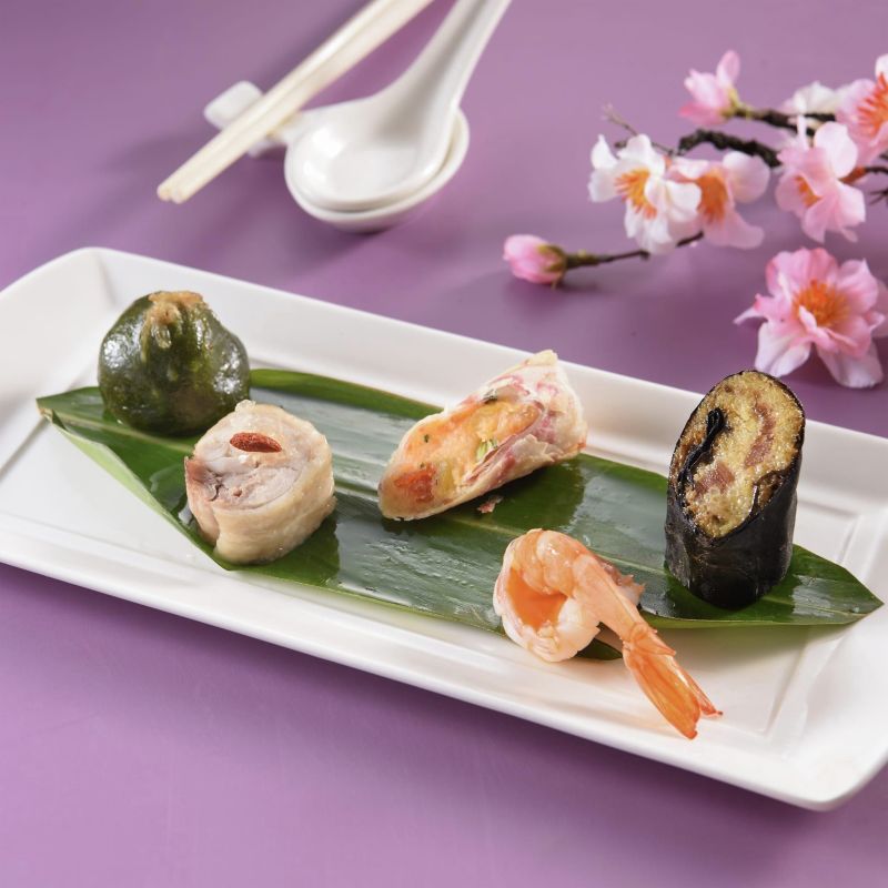 第二道「在地扎根」開胃菜,展現以人為本的台灣地方小吃,萬里地瓜金桔捲象徵總統賴清德的家鄉美食,艾粄、醉雞、酸辣蝦,是不同民族熟悉的口味,還有原民祭典、節慶的傳統食物「吉拿富(cinavu)」。