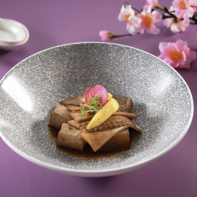 第三道「南國醬滷」,滷水又名滷汁、滷湯,是廣東潮汕地區的調味料,流行於廣東、香港、福建及臺灣等地。早年臺南的移民、貿易都與潮汕相關,飲食文化也受到影響,在地居民承先啟後發展出「滷味」料理,琥珀醬汁鹹甘鹹甘,鵝肉、豆腐、花生、蘿蔔、玉米筍,以潮州滷水的招牌滷鵝做變化,看似簡單的食材卻有不凡的文化底蘊。