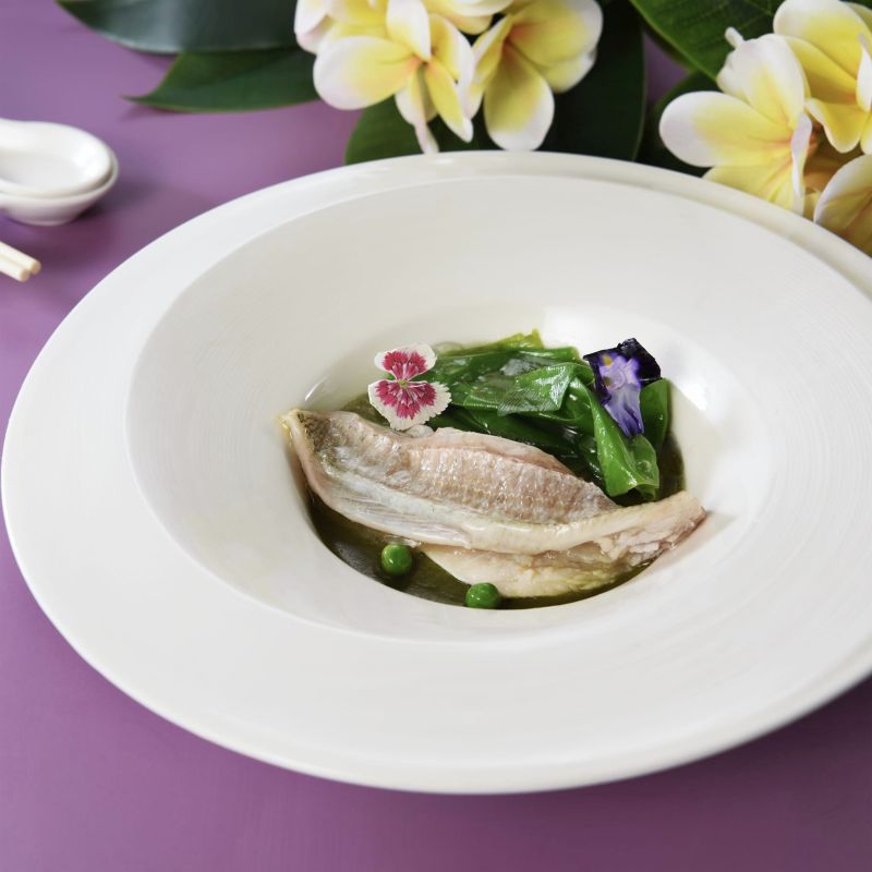 第五道「原味純粹」,這道菜用了素有「平民魚王」稱號的黃錫鯛,是臺灣西部沿海的經濟性魚種,主廚團隊以無毒生態飼養的黃錫鯛,肉質肥嫩軟鮮,搭配刺楤、藥草與山胡椒醬入菜的料理,呈現原民料理令人驚豔的新滋味。