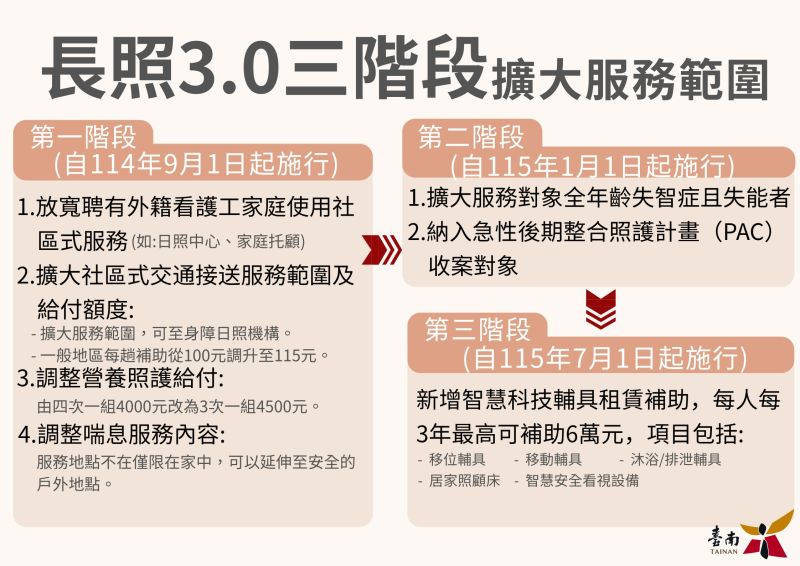 長照3.0計畫預計於115年正式啟動,已有各項新措施從今年起分階段實施,其中第一階段自114年9月1日起開始實施。「長照十年計畫3.0」政策採三階段實施如下: