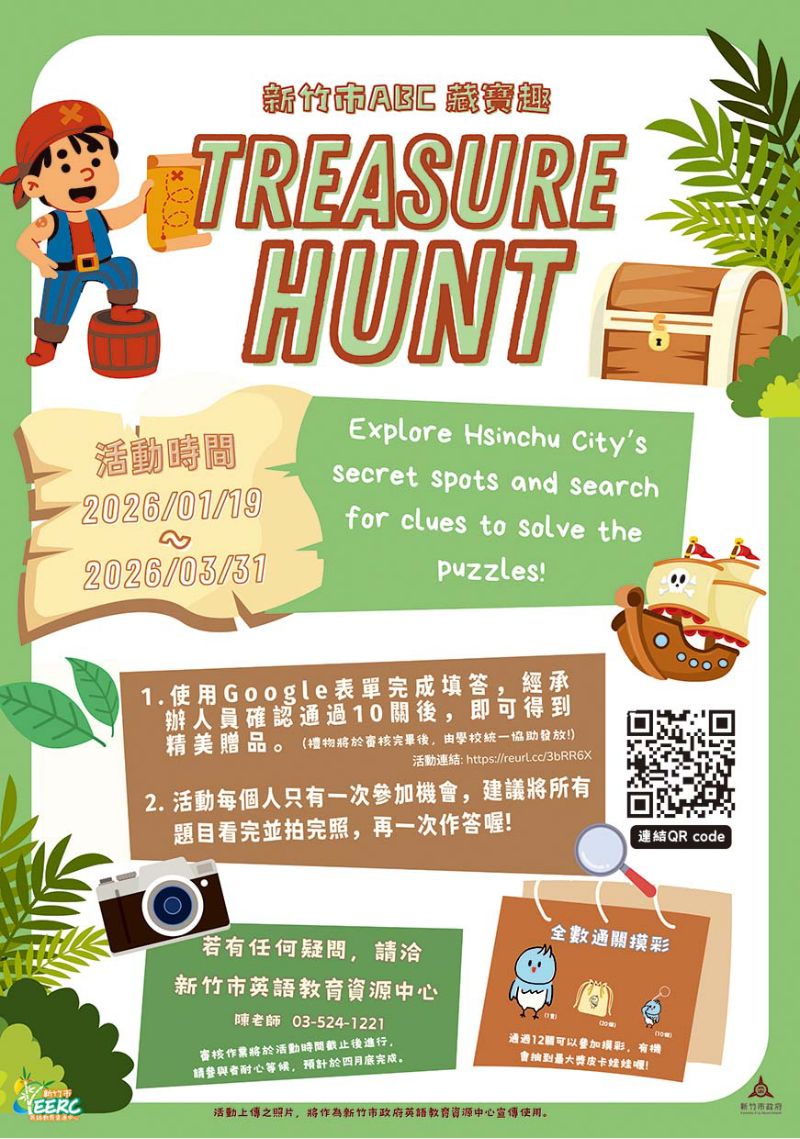 教育處補充,正值春節假期,家長不妨陪伴孩子一起運用英語探索新竹市。透過「ABC藏寶趣」的互動活動,親子不僅能共同發掘故鄉的歷史與現代風貌,也讓孩子在長期、深度的雙語體驗中建立自信,未來能自然地向外國友人介紹新竹的美好與文化,讓世界看見新竹,也讓新竹走向世界。