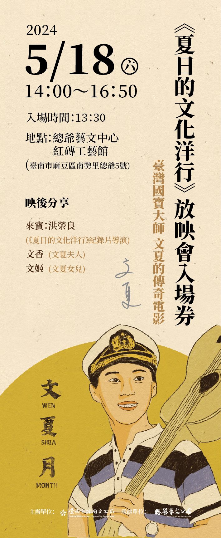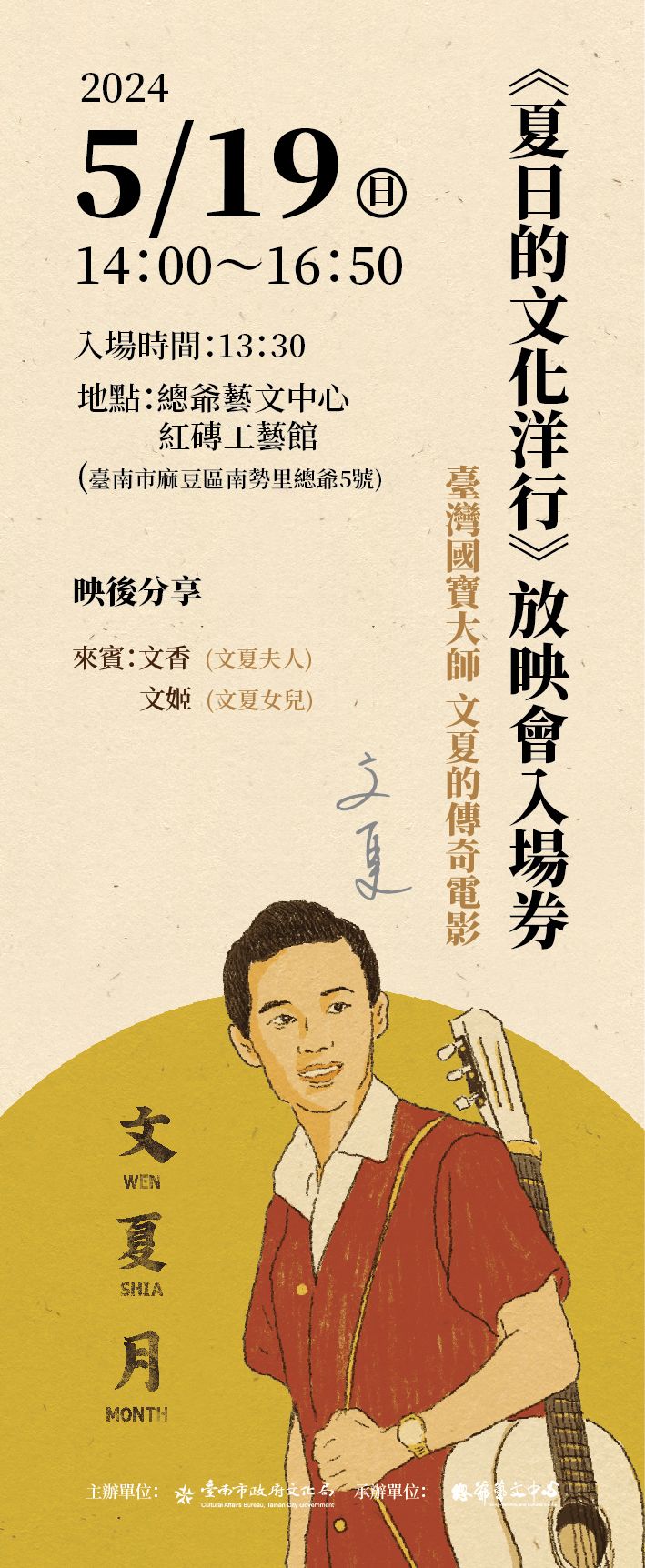 文化局表示,「2024文夏月」特別邀請洪榮良導演、文夏夫人文香及女兒文姬共同合作《夏日的文化洋行》紀錄片之首次包場特映,該紀錄片為文夏生前委託洪榮良導演拍攝,將在文夏冥誕日(5月20日)起開放包場放映,適逢麻豆總爺藝文中心文夏故事館成立周年之紀念時刻,文化局精心規劃於5月18日、5月19日兩日下午假紅磚工藝館進行首次包場特映,搭配文夏月系列活動搶先參與,紀錄片導演洪榮良、文夏夫人及女兒等將親臨放映會分享拍攝心得,放映會後尚有限量文夏自傳《文夏唱(暢)遊人間物語》再版本販售,此書收錄近300張未曾曝光的珍貴照片,回顧文夏縱橫歌壇一甲子的傳奇生涯。紀錄片放映活動因座位有限,將採取線上登記索票形式入場,入場票券亦可帶回家作書籤收藏,請儘早搶票避免向隅。