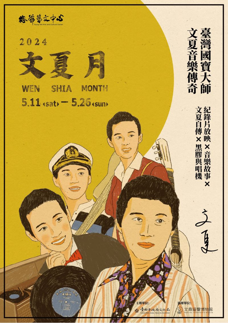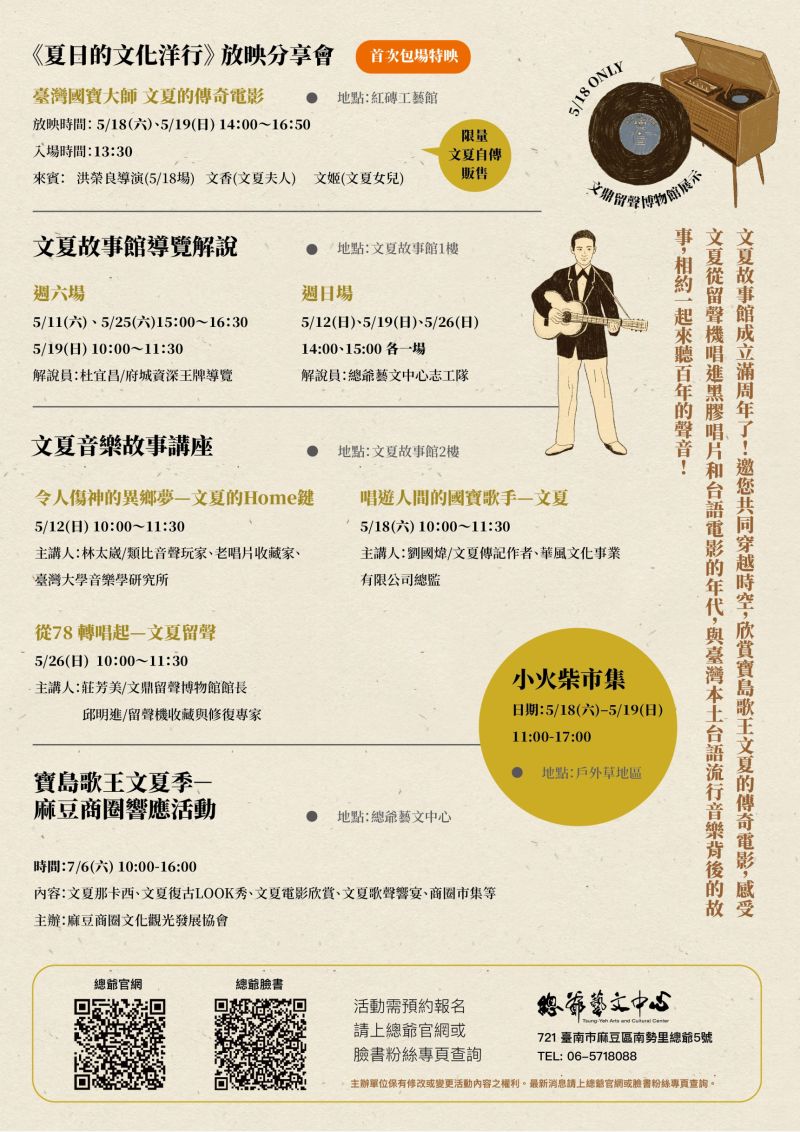 慶祝文夏故事館成立1周年!文化局特別規劃「2024文夏月」,自5月11日至26日期間辦理《夏日的文化洋行》文夏紀錄片放映、文夏音樂故事講座、文夏故事館導覽解說、小火柴市集等一系列精采活動,邀大家一起來總爺藝文中心感受文夏從留聲機唱進黑膠唱片和台語電影的精采年代。