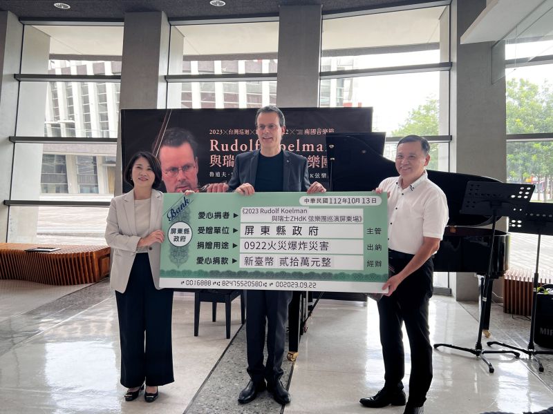 小提琴之神海飛茲的閉門弟子魯道夫寇勒曼(Rudolf Koelman) 與瑞士ZHdK弦樂團台灣巡迴音樂會,今(13)晚於屏東演藝廳首演,本場售票所得全數捐贈公益用途,屏東縣長周春米出席開演前捐贈儀式,致贈感謝狀給贊助單位,盼透過音樂傳遞愛與關懷,為屏東帶來溫暖。