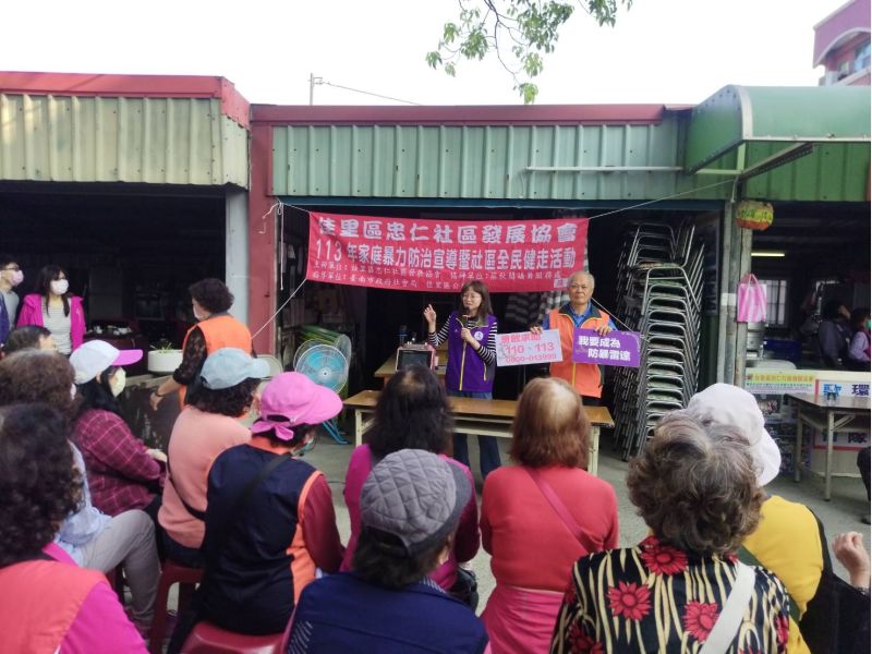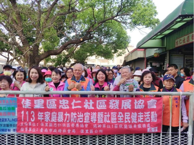 台南市佳里區忠仁社區發展協會為提倡正當休閒活動及鼓勵社區高齡長者走出社區,舒展筋骨,促進健康,籲請大手牽小手,從事戶外活動,珍愛自己,熱愛生命,特結合社區歌友會俱樂部成員以健行方式達到社區聯誼的目的。於3月17日舉辦健行活動於上午6時32分在佳里區忠仁社區廣場集合熱身,場面熱絡,約180人參與,7時出發,沿忠仁里信義一街、信義二街、平等街、博愛街、建中街、延平路、半角社區、信義一街及社區道路,途經佳池宮、信義國小、雷明宮及南天宮,全程約4.5公里,回到社區廣場再兌換運動毛巾、礦泉水、菜包及早餐禮盒,然後聆聽反家暴及善用「113」全國婦幼保護專線與廉政等警政宣導後圓滿結束。