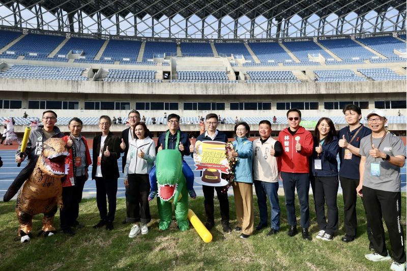 2026高雄富邦馬拉松16周年10日於高雄國家體育場熱血開跑,市長陳其邁出席「最速恐龍爭霸賽」,身穿恐龍裝與高雄熊、蜜柑站長等人氣吉祥物們,以及Fubon Angels、海神啦啦隊女孩及恐龍們同場互動、進行趣味競賽,賽前活動熱身氣氛熱烈,會後陳其邁也小唱一段名曲〈紅豆〉,與市民一同感受賽事歡樂氛圍。