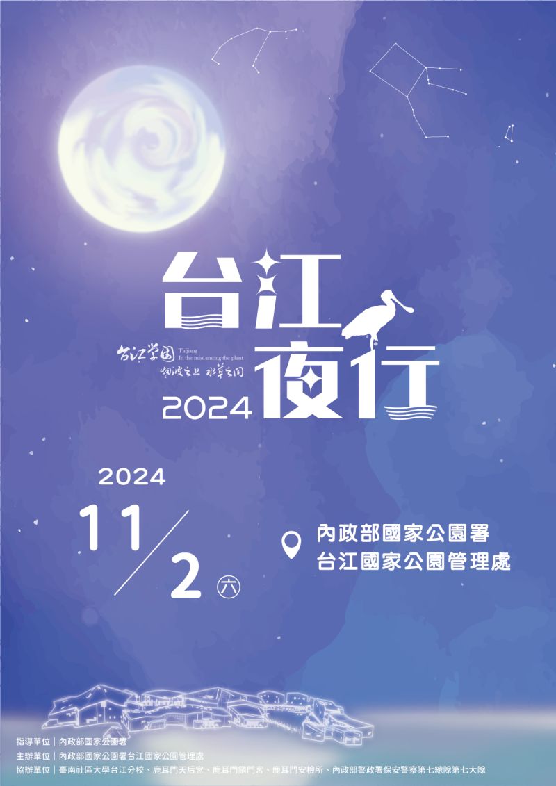 內政部國家公園署台江國家公園管理處(以下簡稱台江處)為讓民眾體驗園區特有的濕地生態與人文歷史,多年來與在地NGO團隊持續攜手辦理「台江夜行」,也是很多民眾每年期待的活動。2024年「台江夜行」活動訂於113年11月2日辦理,期望繼續匯集眾人之力,一起守護河川,守護土地。