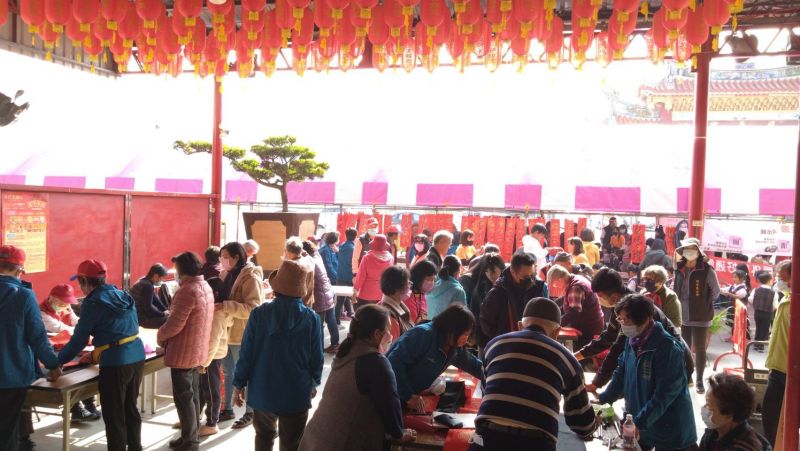 民眾紛紛排隊請老師們抒寫心中的吉祥話,諸位書法老師們專注又鄭重地寫下新春吉語,廟方志工穿梭於老師間幫助晾掛春聯並發放給殷殷期盼的民眾。
