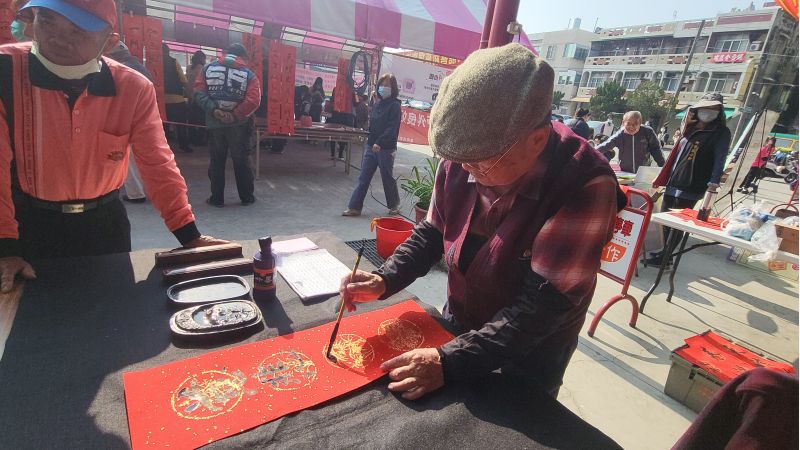 民眾紛紛排隊請老師們抒寫心中的吉祥話,諸位書法老師們專注又鄭重地寫下新春吉語,廟方志工穿梭於老師間幫助晾掛春聯並發放給殷殷期盼的民眾,小朋友也在現場體驗親子單字春聯創意DIY,趣味創意圖章拓印及塗鴉,又寫又畫,好不熱鬧。