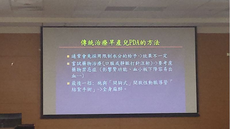 成大醫院小兒科團隊具有信心積極處理各種開放性動脈導管導致的呼吸症狀,像出生體重僅462公克、懷孕週數22+4的小男嬰,在出生第7天時出現急性肺出血,當時體重只有478公克,團隊也順利使用心導管手術治療成功,是已知文獻中體重最低記錄。