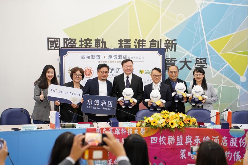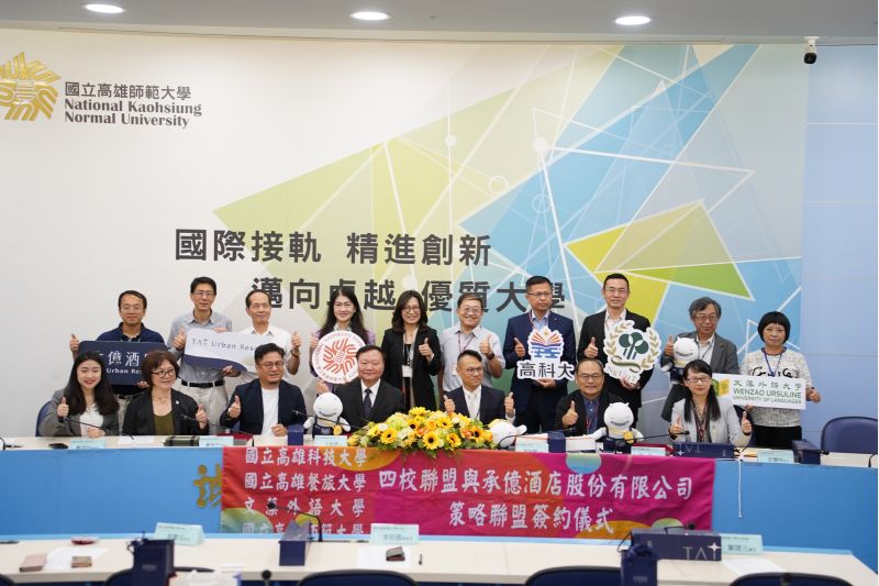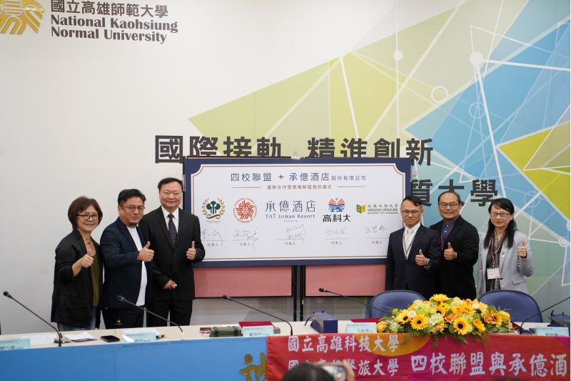 南部知名大學-高雄師範大學、高雄科技大學、高雄餐旅大學及文藻外語大學等四校,在高師大校長王政彥的提議與引介下,於今(27)日下午2點,假高師大和平校區行政大樓10樓國際會議廳,與當前全台最美最紅的酒店-承億酒店簽署策略聯盟。分別由高師大校長王政彥、高科大副校長郭俊賢、高餐大副校長李一民、文藻外大校長莊慧玲代表學校,與承億酒店董事長戴俊郎共同簽署合作備忘錄。期能有效整合學產資源,增進實務與學術經驗交流,提升合作夥伴關係及競爭力,拓展產學合作與學生實習與就業機會,以達成「資源共享與促進產業發展」目標。