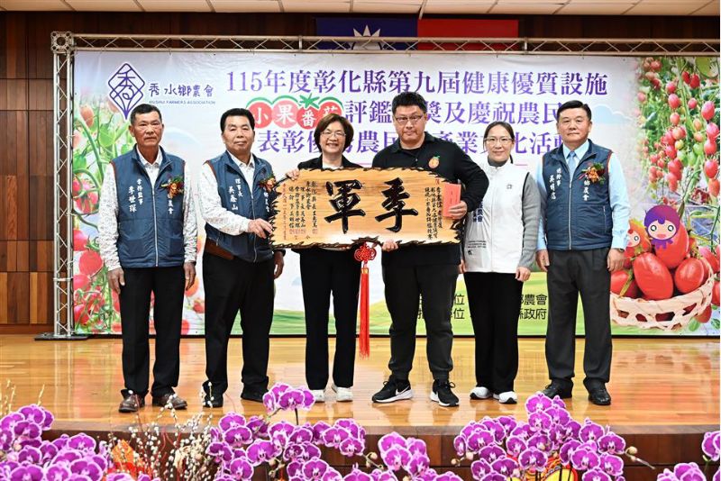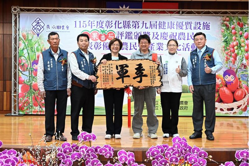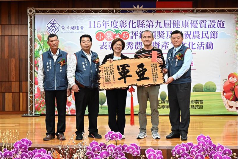 秀水鄉農會於今(3)日舉辦「115年度彰化縣第九屆健康優質設施小果番茄評鑑」頒獎典禮,同時慶祝農民節,表揚優秀農民及推廣產業文化,彰化縣長王惠美、秀水鄉農會理事長吳鑫山、常務監事李世琛及總幹事吳明信等人與會。王縣長表示,感謝農友用心栽種,讓彰化的小果番茄在市場上深受喜愛,也要恭喜27名獲得表揚的優秀農民,都是農業界的菁英與榜樣,在農業上的貢獻值得大家推崇與肯定。為協助農民,縣府規劃智慧農業補助與青農學堂,透過最新科技與農機具,讓農民耕作時更加便利,同時吸引更多青年返鄉。