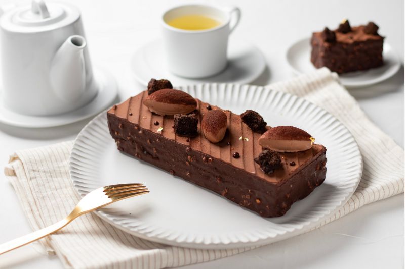 「榛果巧克力蛋糕」以奧地利知名的沙哈蛋糕為基底,加入榛果脆層、巧克力甘納許,多層次的疊加,讓你每一口都有不同層次的味蕾享受。