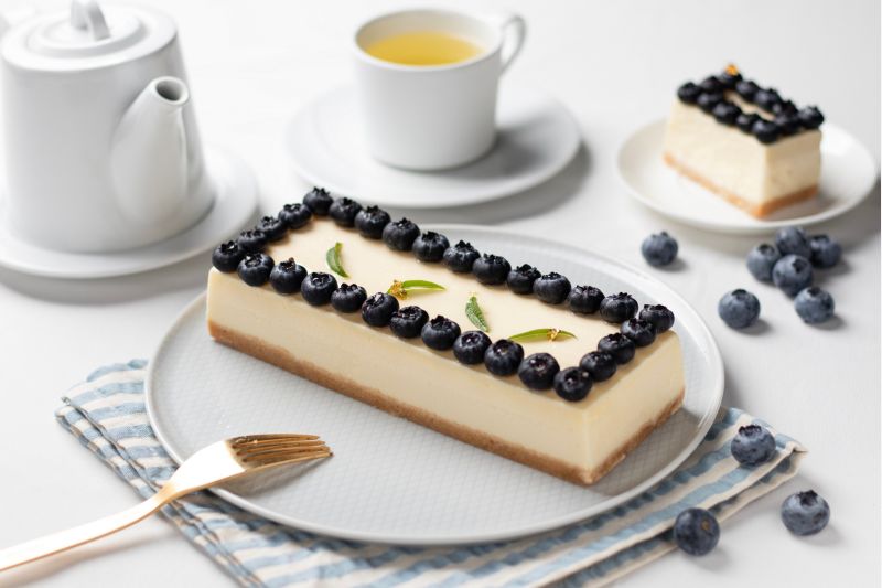 「紐約白乳酪蛋糕」屬於起司蛋糕的經典款,濃郁、細緻、綿密、滑順,配上新鮮藍莓與奶油餅乾底,讓人一口接一口。