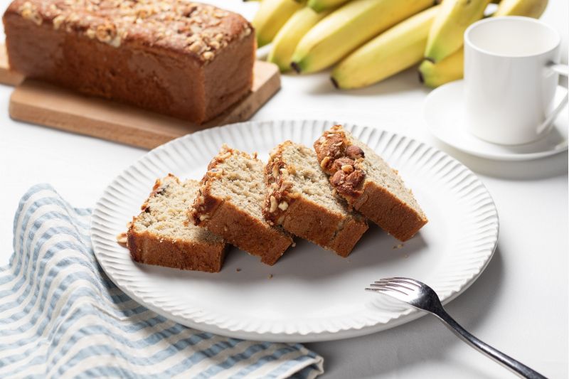 「香蕉蛋糕」選用熟成的新鮮香蕉和麵糊,以3:7的黃金比例攪拌後,上面灑上堅果碎、杏仁片增脆與增香,烘烤後形成外表焦脆,中間濕潤,滿滿香蕉味相當迷人,是美式家常甜點。