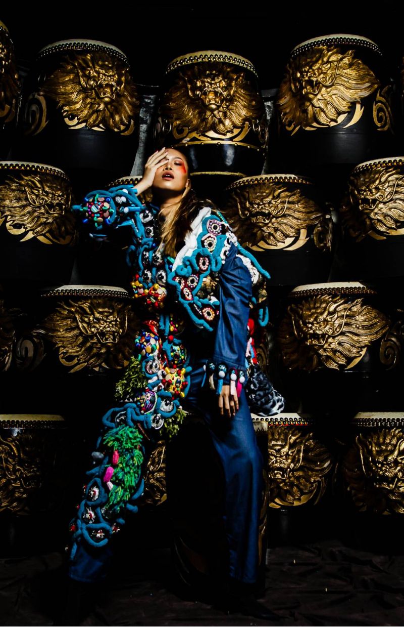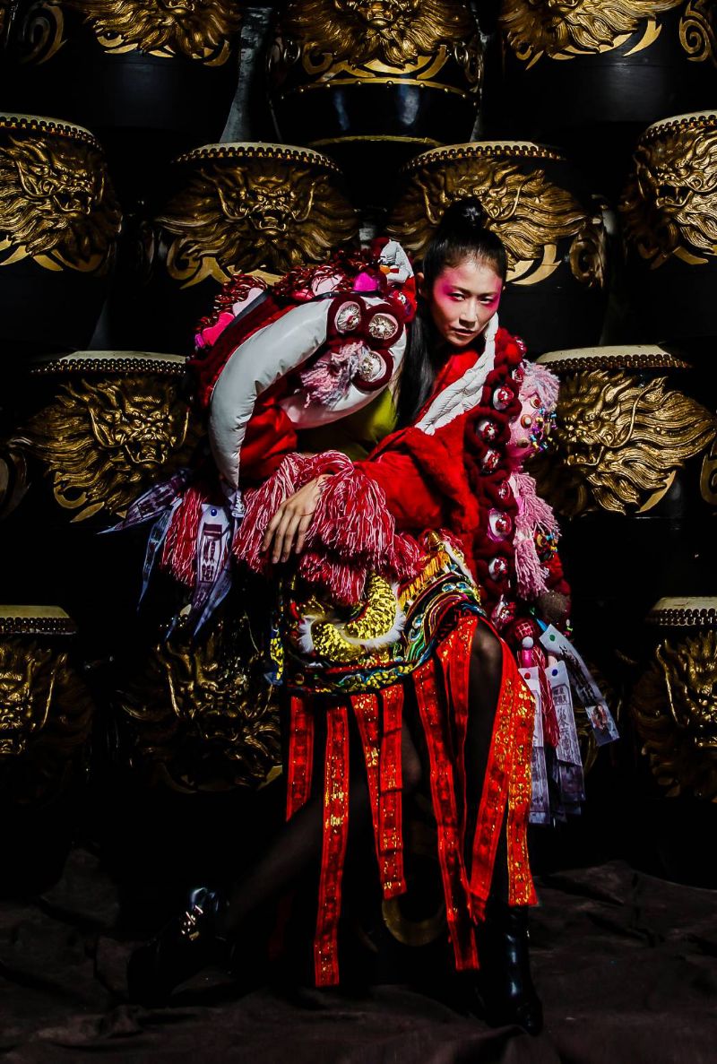 一件以中國祭祀與道教文化為靈感的核心作品中,主體人物身披獅首紋飾,紅底繡有金色符籙,背景為雕刻神獸與符紋的黑金戰鼓,整體構圖宛如祭儀現場。