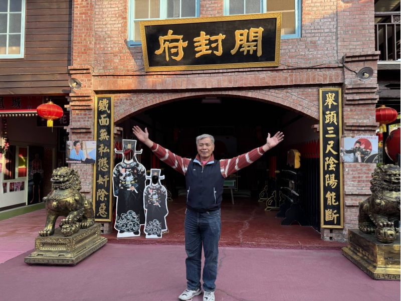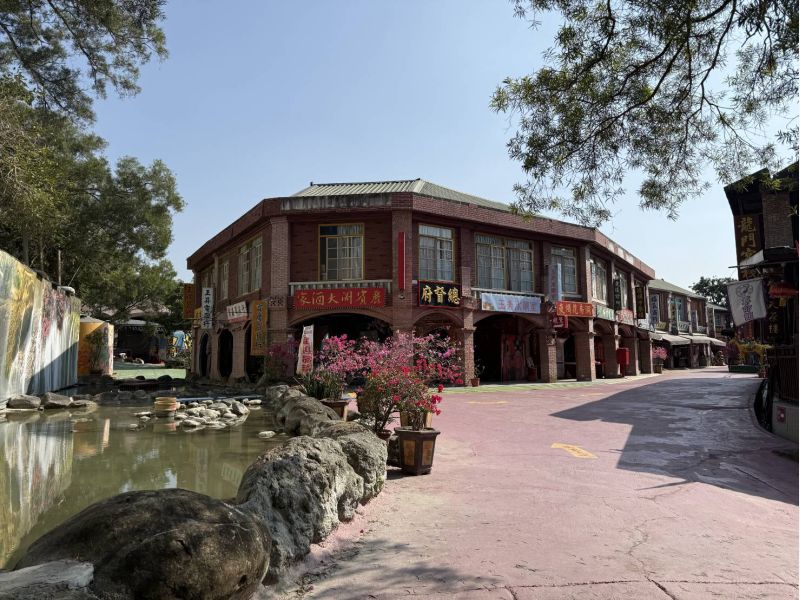 老街區設有大涼亭供遊客休憩,坐在亭中遠眺園景,微風拂面,格外舒適。布袋戲場景旁的看板寫著「導演自己當」,讓遊客也能即興上台演出,體驗戲劇樂趣。