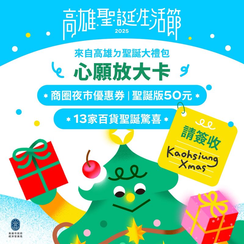南台灣最強聖誕饗宴「高雄聖誕生活節」從11月28日正式啟動,26米聖誕樹點亮中央公園,吸引每週末數萬人潮造訪!本週六至下週三(12月20日至24日)起,更將進入眾所矚目的「聖誕黃金週」,不僅有落日飛車Sunset Rollercoaster、滅火器 Fire EX.、美秀集團、麋先生MIXER、鄭宜農、韋禮安等 25 組超強卡司「連續五天」開唱,經發局更聯手高雄13家百貨公司,推出專屬高雄聖誕回饋「心願放大卡」活動,於12月20日至24日期間可至現場領取心願放大卡,即享「市集消費滿200送50元商圈夜市優惠券」及「13家百貨憑卡聖誕優惠」雙重回饋,百貨好禮包括iPhone、千元餐飲券抽獎以及直送100元購物金、旋轉木馬免費搭乘、溜冰券等多項好康,最浪漫的冬日購物指南就在高雄聖誕生活節。
