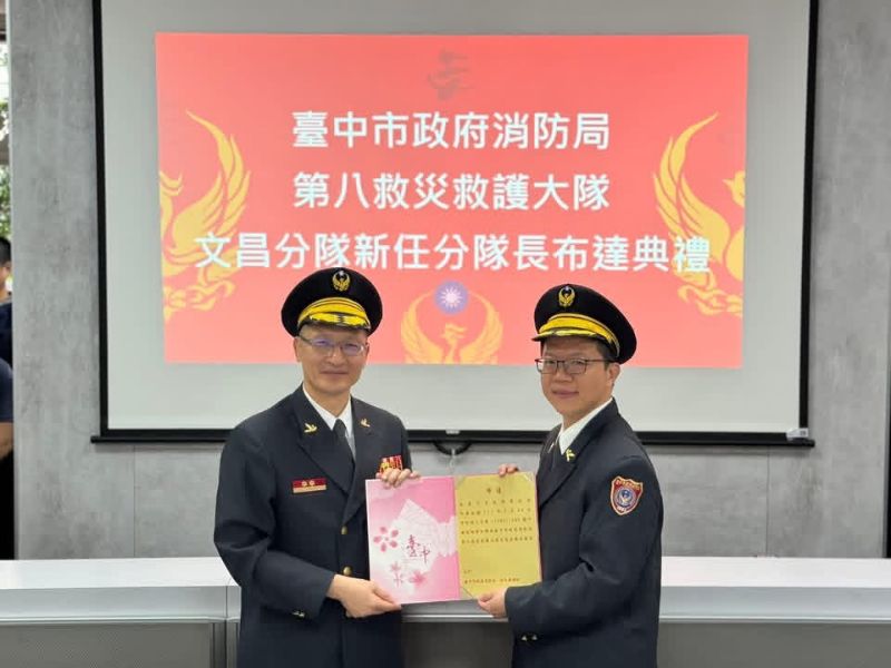 臺中市政府消防局第八大隊文昌分隊於今日舉行分隊長布達典禮,由大隊長呂鴻隆親自主持並監誓見證。在各級長官、地方仕紳及消防、義消同仁的共同注目下,新任分隊長林家全正式接過重擔,象徵文昌分隊邁入責任傳承與守護升級的新篇章。