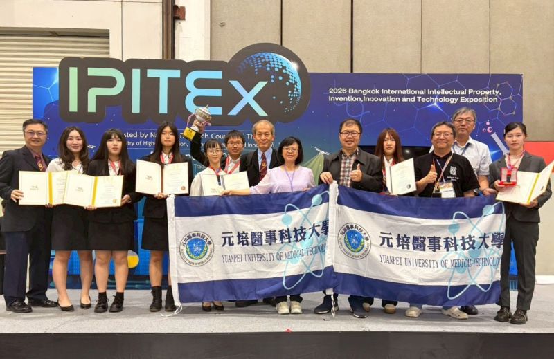 2026 曼谷國際發明展於1月5日至9日圓滿落幕,元培由圖資長劉仁筑老師帶領多系所師生參賽,在醫療器材領域表現尤其亮眼,三件金牌作品不僅具備技術創新,更具備高度市場應用價值;由醫學影像暨放射技術系郭宗德老師指導林秉訓、林東岳、李星霖、邱士睿同學研發的「內耳微血循環促進裝置」,該作品運用光生物調節(PBM)技術解決耳鳴與突發性耳聾困擾,並已獲得 TFDA 核准 IRB 於台北榮總進行多年臨床研究,數據顯示能提升治療確效,其卓越的醫療貢獻,更讓大會特頒傑出發明與創新特別獎。