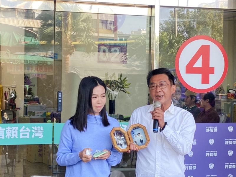 許智傑女兒今天帶兩張照片,給準備車掃的爸爸加油。她說,這兩張照片從小放在她的床頭櫃。一張是阿嬤的照片,阿嬤很疼愛我們,叫我們做人要認真、要好心,對家人影響很大。另一張照片是爸爸的手牽著她,雖然爸爸整年不在家,她還是感謝爸爸給她最大的愛,會陪伴爸爸走完選前最後一哩路。