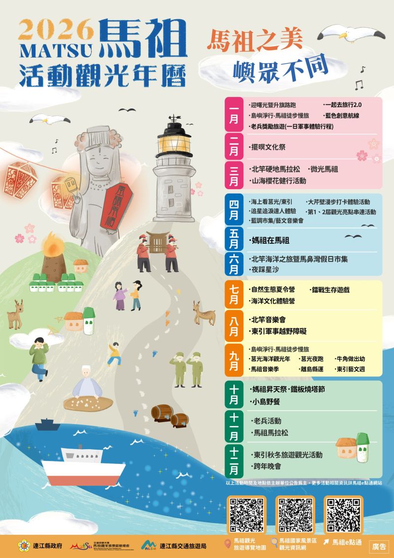 10 至 12 月秋冬時節,馬祖回歸信仰與人文底蘊,規劃系列媽祖文化活動與巡香行程,並結合離島運動觀光元素,串聯宗教、聚落與島嶼生活風景,邀請旅人以慢遊步調走進四鄉五島,在歲時節慶與人情溫度中,為一整年的島嶼旅程畫下溫暖而圓滿的句點。